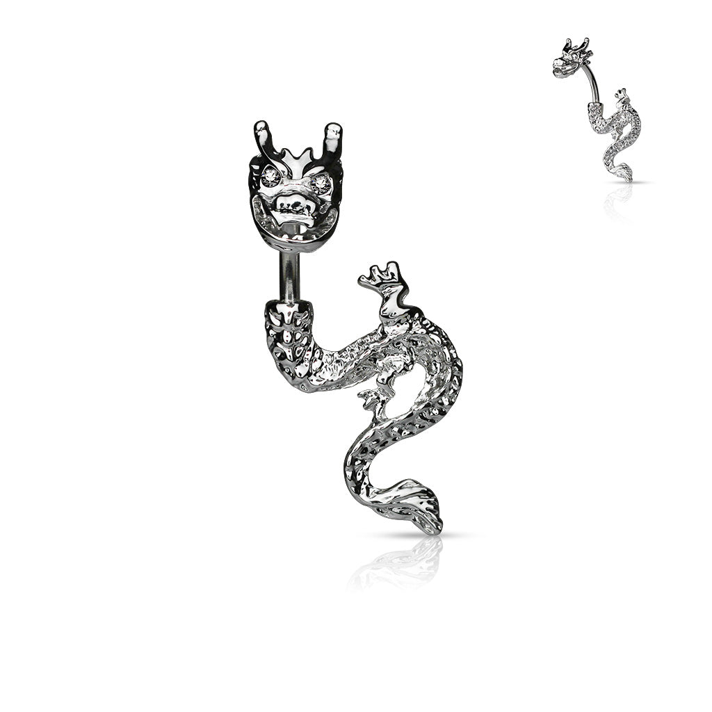 Ein beeindruckendes Bauchnabelpiercing mit einem kunstvollen Drachen-Design. Gefertigt aus hochwertigem 316L Chirurgenstahl, veredelt mit Rhodium und funkelnden Kristallen in den Augen.